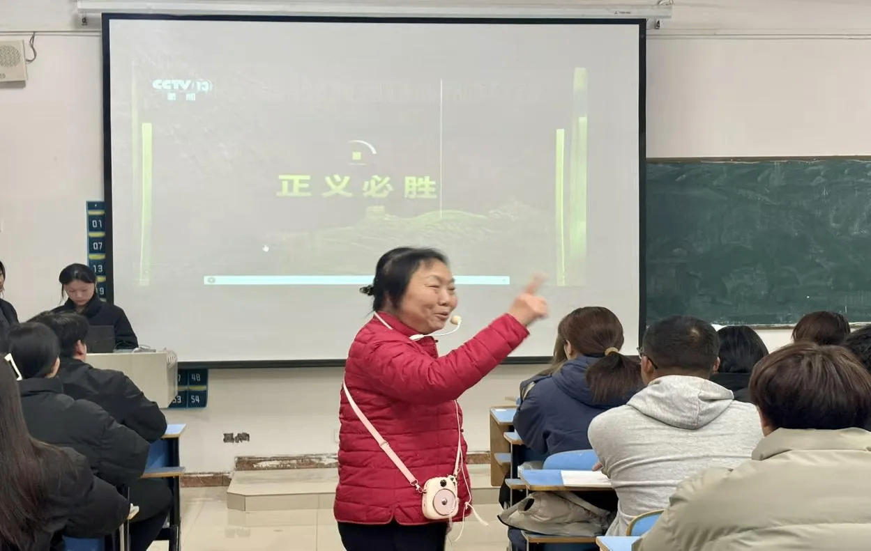 报告以隆重纪念中国人民抗日战争暨世界反法西斯战争胜利80周年为核心脉络,开篇援引习近平总书记重要讲话:“今天我们隆重集会纪念中国人民抗日战争暨世界反法西斯战争胜利80周年,共同铭记历史,缅怀先烈,珍爱和平,开创未来。” 胡正晨带领同学们重温了2025年9月3日的光辉时刻——上午,天安门广场举行盛大纪念大会与阅兵仪式,彰显正义力量;夜晚,人民大会堂上演《正义必胜》文艺晚会,用嘹亮歌声与雄壮舞姿唱响胜利华章,让学子们直观感受伟大胜利的历史分量与时代意义。