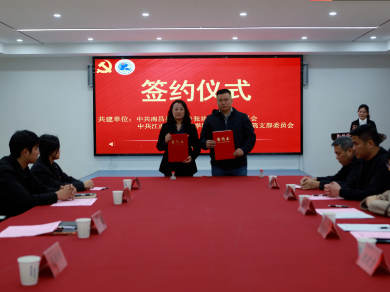 为深化党建引领作用,搭建党支部共建交流平台,推动校地党组织资源共享、优势互补、共同发展,2025年12月10日下午,江西科技职业学院国际与教育学院党支部与富山乡张坊村党总支在“一站式”学生社区多功能厅隆重举行党建共建签约暨揭牌仪式。富山乡党委副书记周赤平出席仪式并讲话,国际与教育学院党支部书记廖晨、富山乡张坊村党总支部书记赵文扬分别代表双方签约。张坊村党总支支委及党员代表和学院党支部支委及党员代表参加活动,共同见证校地党建合作开启崭新篇章。