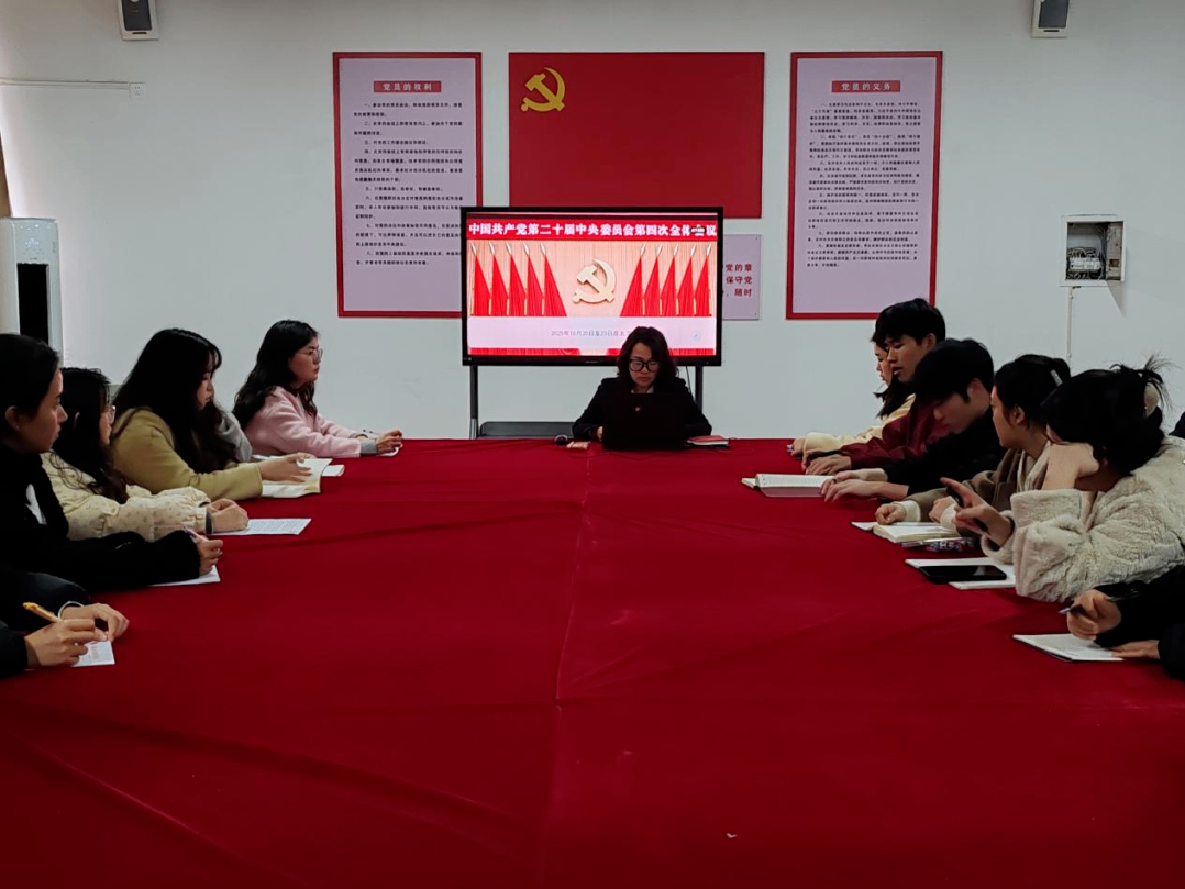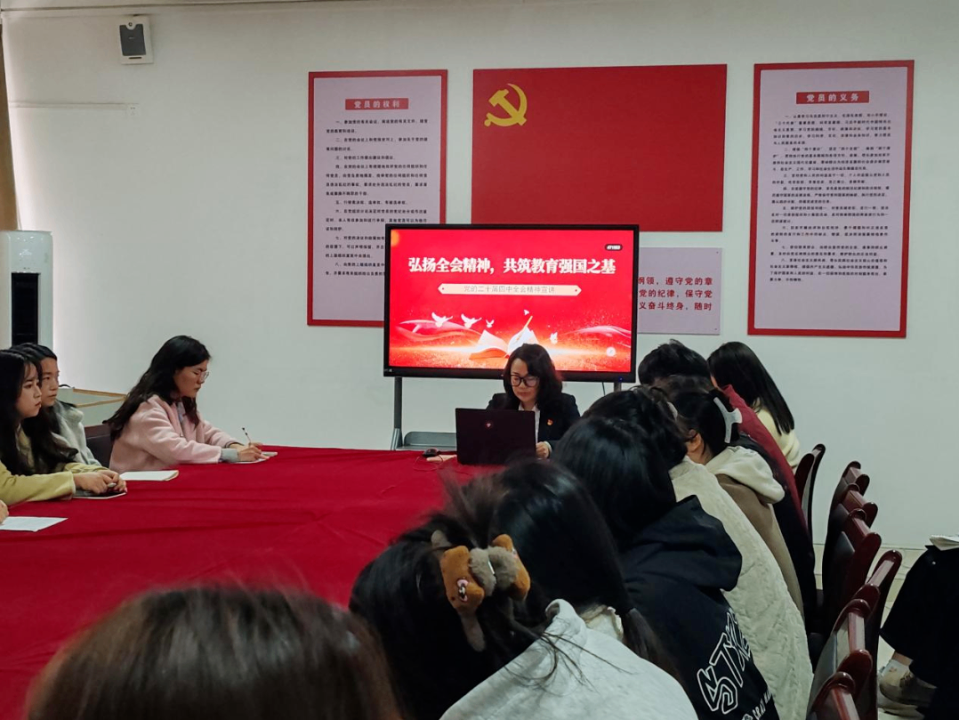 为深入学习贯彻党的二十届四中全会精神,切实把师生党员的思想和行动统一到全会部署上来,12月12日,国际与教育学院党支部组织开展专题党课学习活动。此次党课由党支部书记廖晨主讲,学院全体师生党员及入党积极分子代表参与学习。